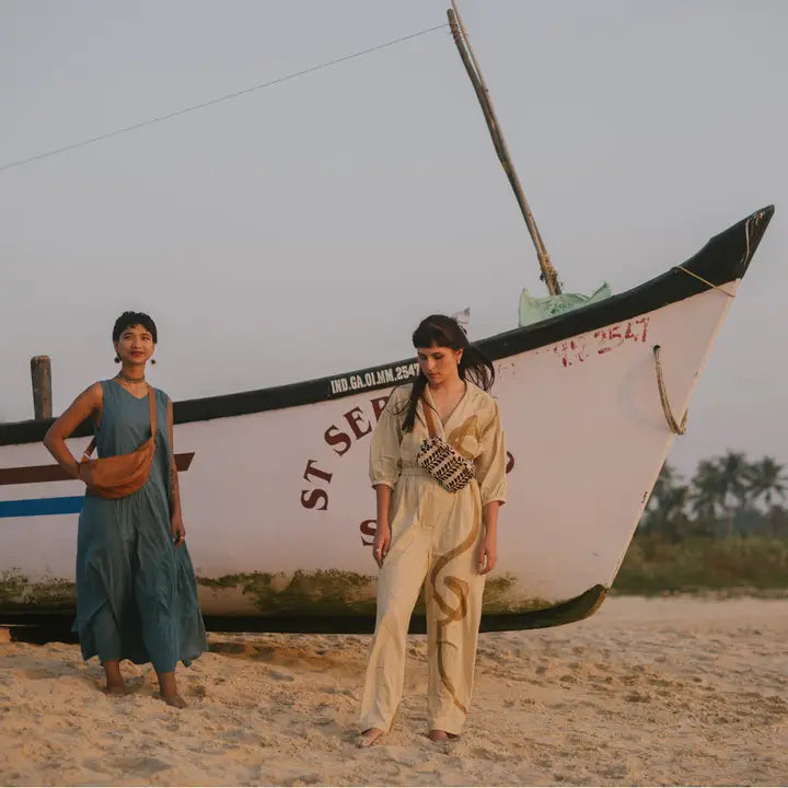 Materials: hand spun, hand woven cotton with recycled leather piping and crossbody strap